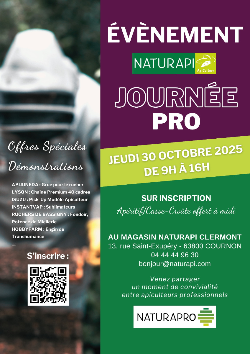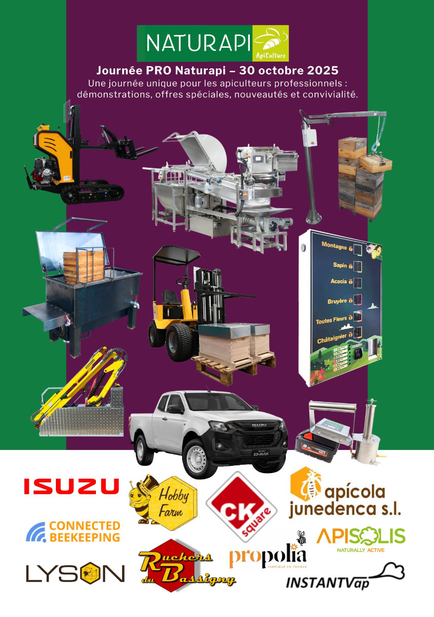 Laurent de NATURAPI a mobilisé son réseau pour organiser une belle journée où vous pourrez découvrir beaucoup de matériel et les dernières innovations. Le parking devant le magasin sera plein de matériel : chaine d’extraction, matériel Bassigny, chariot de transhumance, grue, mais aussi nos palettes connectées et nos balances de ruches.